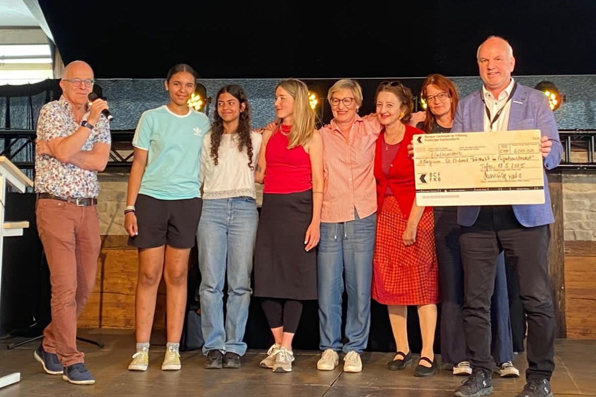 ... au groupe d'élèves de 2ème année emmené par Lea Studer et Patricia Käch Cortés qui a gagné le premier prix du concours "Hie va Det" avec le projet "Solidarité : Migration", mené pendant la semaine de la durabilité.